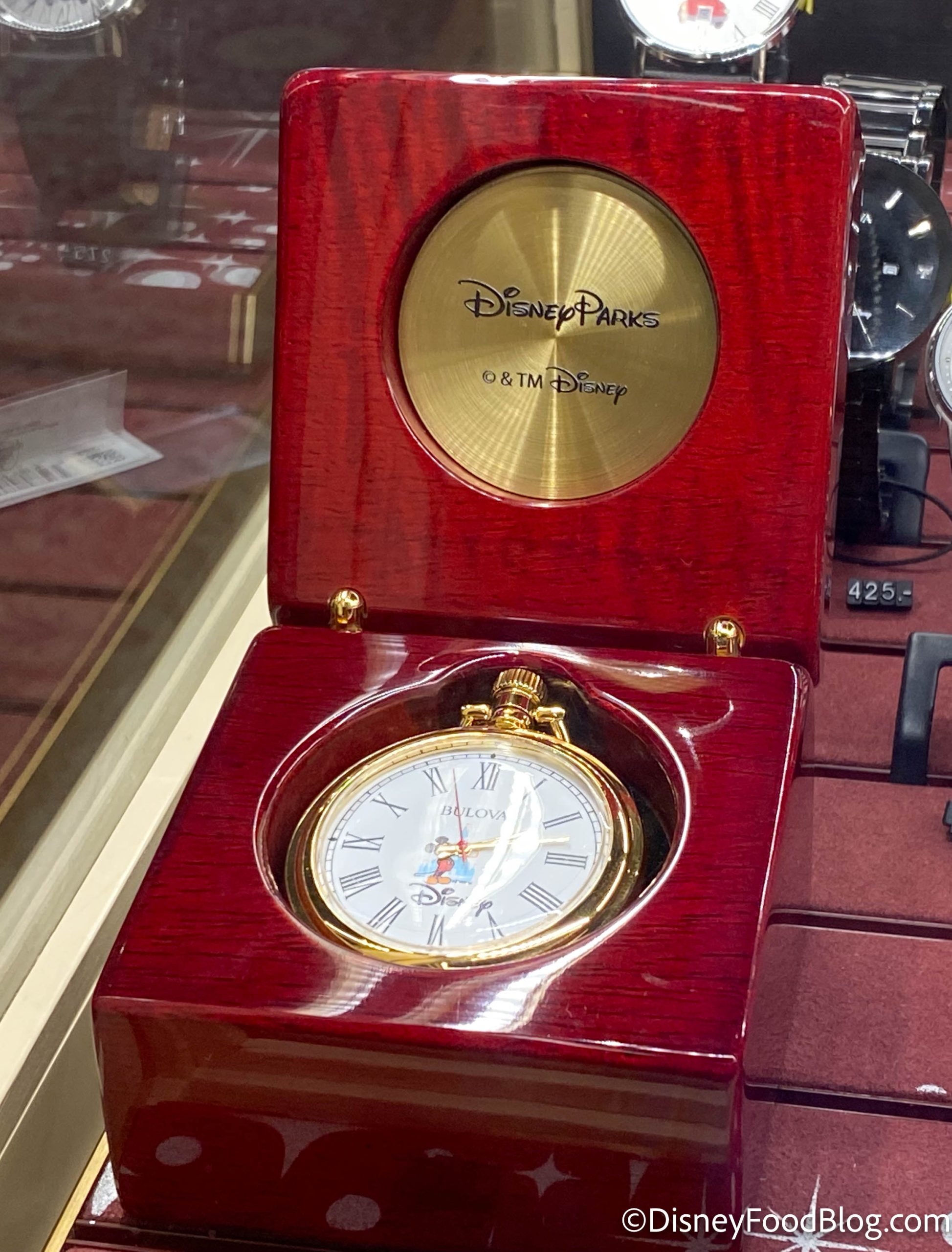 There’s a new Disney Parks Bulova Pocket Watch for $150. It comes in a mahogany box and the watch face has an image of Mickey and Cinderella Castle.