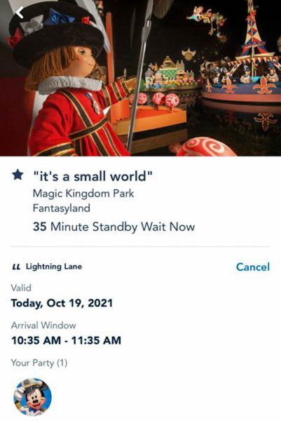 But you CAN cancel Genie+ Lightning Lane reservations. These are the ones included in the standard Genie+ system. If you book a Lightning Lane reservation for “it’s a small world” with an arrival window of 10:35AM to 11:35AM and then decide you don’t want to ride at that time, you can just hit “cancel” and follow the promptings to cancel that reservation.