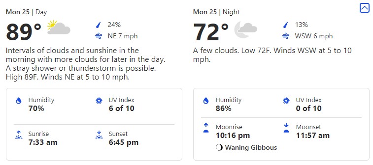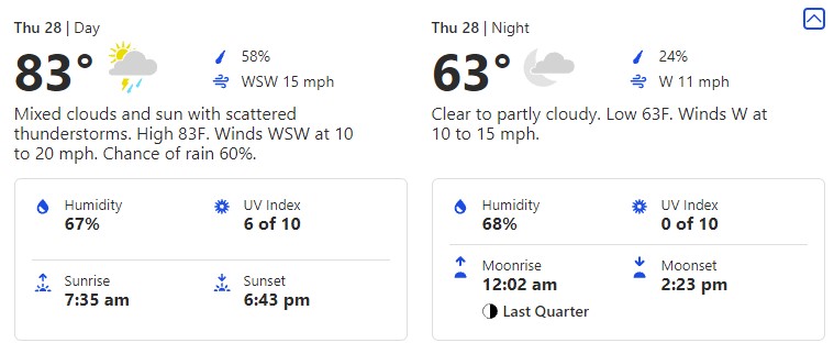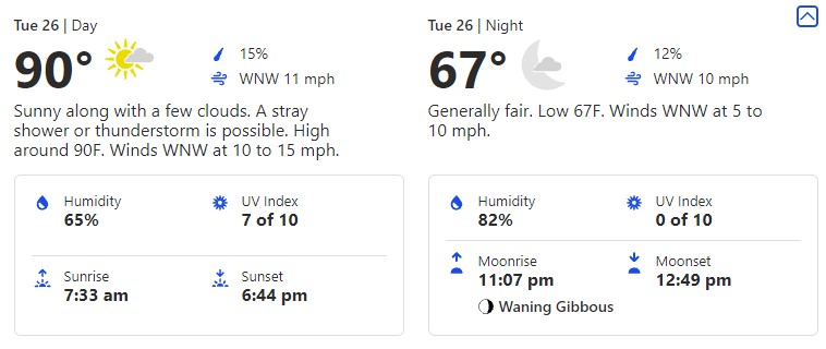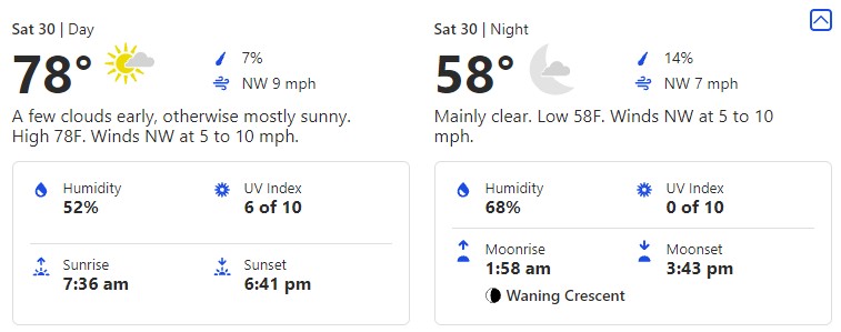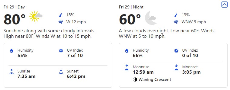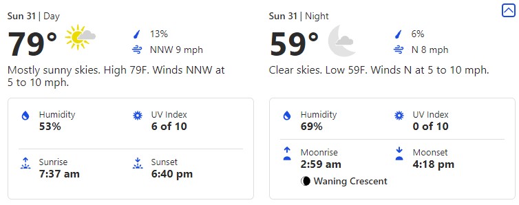You’ll notice there is a DRASTIC drop in temperatures to the low. That’s a full 23-degree difference between the high and the low! It might be a good idea to pack a layer in case you get a little chilly once it’s nighttime.