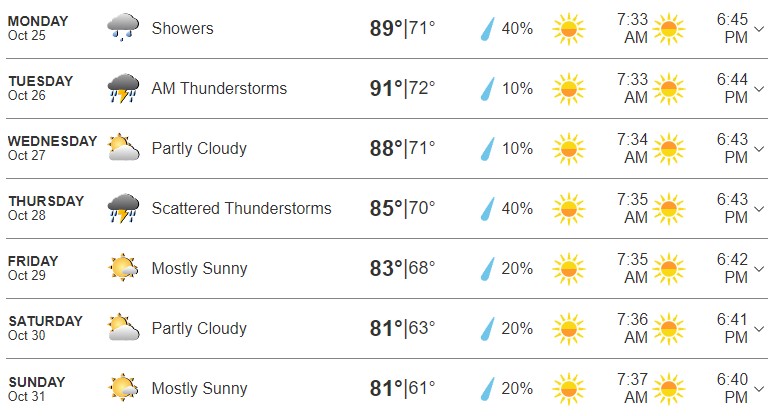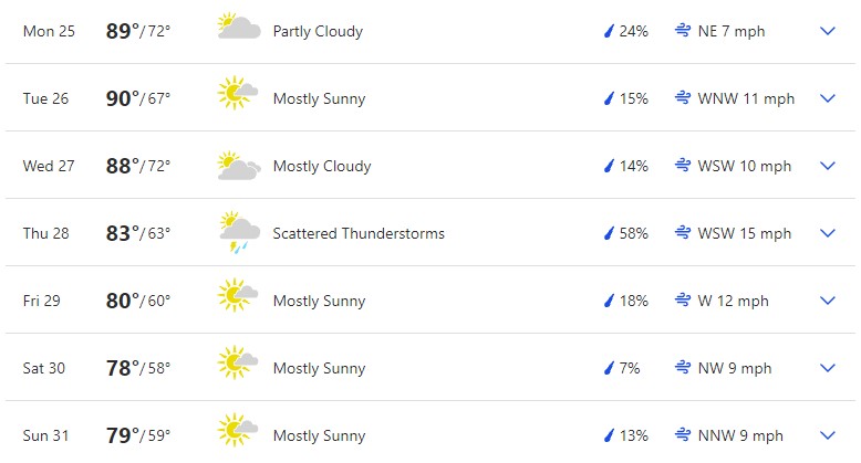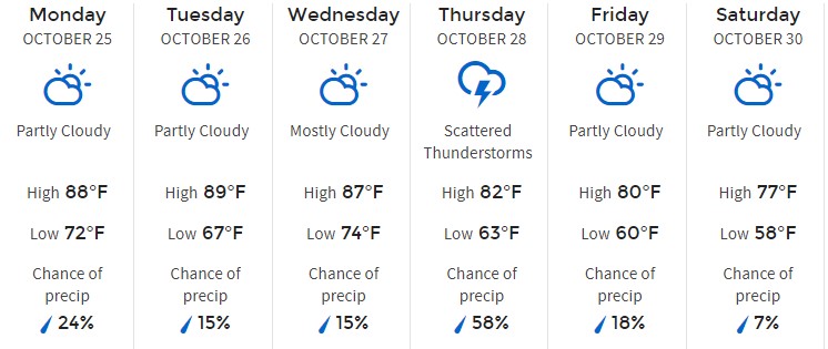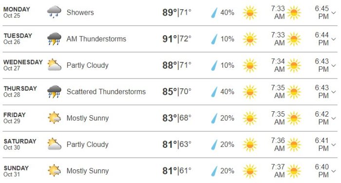 Here is a full overview of the week according to The Weather Channel. Temperatures are projected to get cooler towards the end of the week. We’re looking at a range of 70s to 90s highs and 50s to 70s lows.