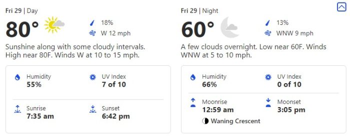 For Thursday, October 28th, we’re seeing a little drop in temperatures to the low-80s and an evening at 63 degrees. Wow! That’s a cool night!