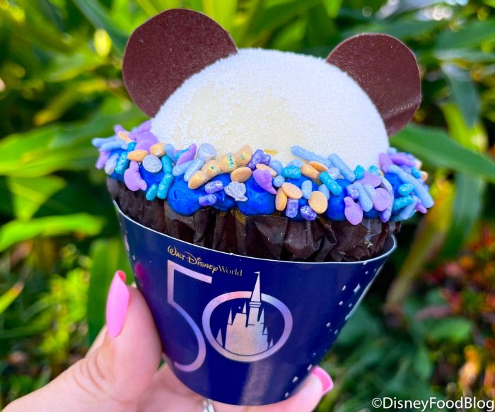 Usually around this time of the year, we are inundated with orange icing, fall flavors, and pumpkin treats. We’re not kidding when we say it feels like Disney opens the black and orange sprinkle floodgates and we find ourselves drowning in a sea of pumpkin spice EVERYTHING. And although we’ve had a few Halloween treats (most of the new ones were at Boo Bash, but we’ll get to THAT in a second!), they really haven’t been around much this year. Why? Because the 50th Anniversary started on October 1st and brought in over 150 new food and drink items.