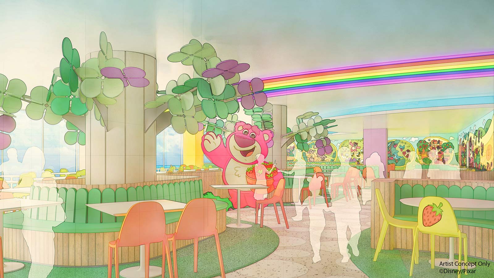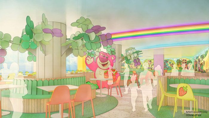 The hotel will have a cafe called Lotso Garden Cafe, which will offer a buffet at breakfast and dinner. There will also be Gift Planet (a Disney Shop), Shop Together (a hotel shop with necessities like diapers and more), Slinky Dog Park (which is the plaza in front of the main entrance), Toy Friends Square (the garden off of the lobby), and more.