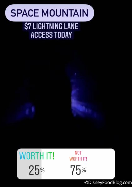 Over in Magic Kingdom, Space Mountain’s Lightning Lane cost $7 this day, and 75% of our readers voted to skip it. Although Space Mountain usually has a long-ish wait, there are other attractions you might want to prioritize. Remember, you can only book 2 pay-per-ride reservations per day.