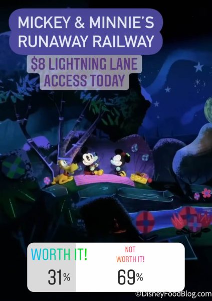 78% of our readers voted that Expedition Everest in Disney’s Animal Kingdom is not worth paying for. On this day, the Lightning Lane cost $7.