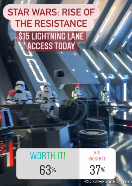 Surprising no one, Star Wars: Rise of the Resistance is the number one ride voted worth it! 63% of readers voted that paying $15 for the Rise of the Resistance Lightning Lane is well worth the cost.