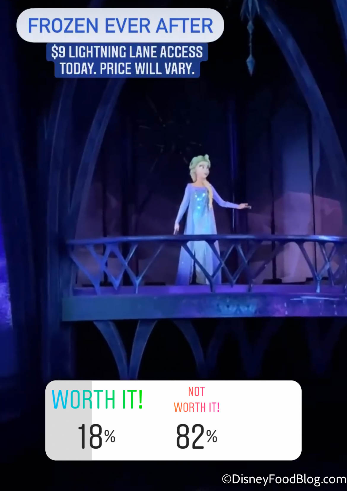 Frozen Ever After wins the prize of the lowest number of votes, with 82% of our readers voting that this EPCOT ride is NOT worth the cost. On this day, Frozen cost $9 for Lightning Lane access.