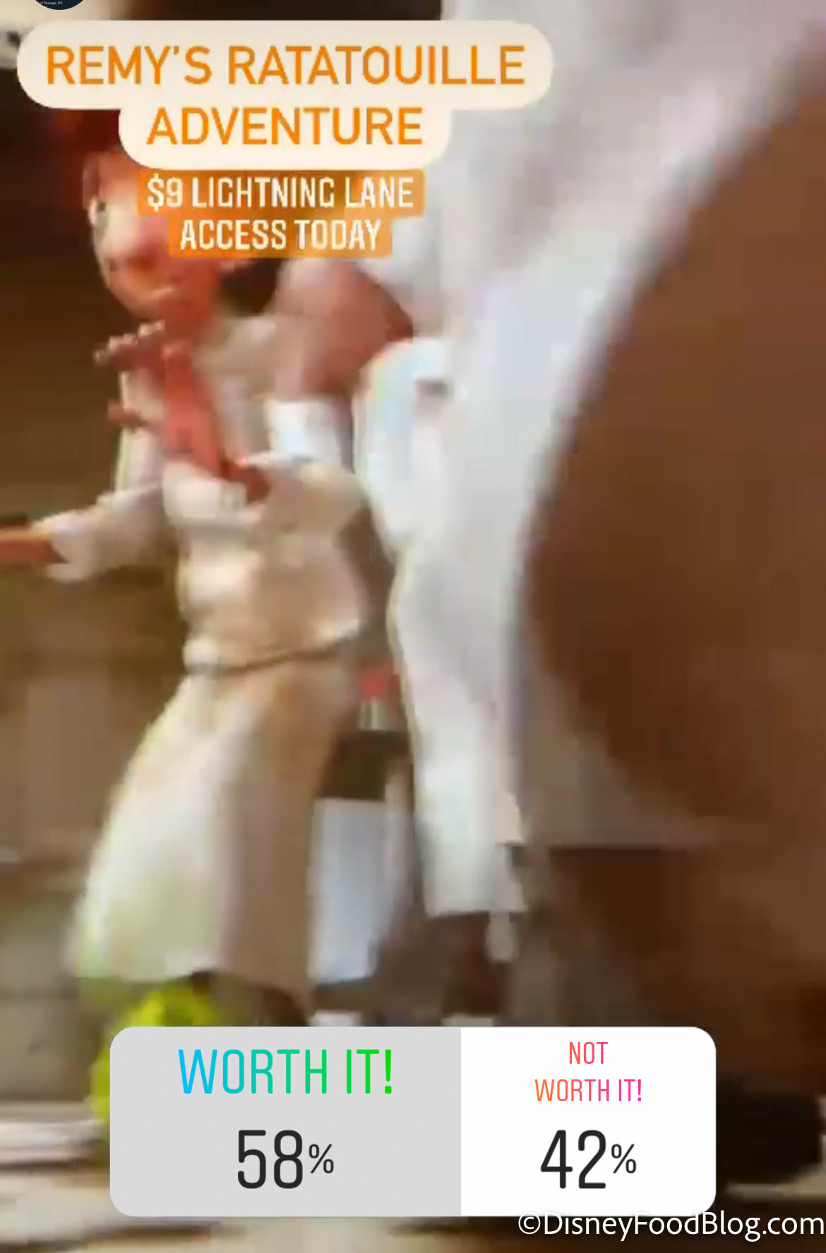 EPCOT’s newest ride, Remy’s Ratatouille Adventure, was voted worth it by 58% of readers! This ride, featuring our favorite rat Remy from Disney and Pixar’s Ratatouille, was $9 for Lightning Lane access on this day.