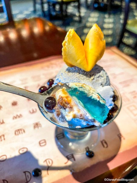 The highlights of this dish were the light and floral flavor of the ice cream, the delicious and crunchy toffee, and the fun fortune cookie on top! We aren’t huge on jelly, so the lychee element of this dish was a bit of a miss for us. We’d recommend this one for people who love jelly and popping boba pearls because of those elements are both pretty prominent in this dish.
