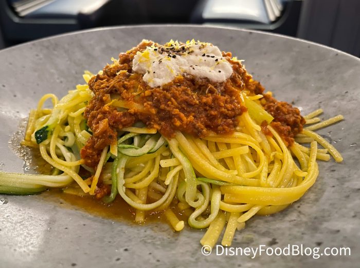At the bottom of our list of entrees was the Terra-Bolognese with Corn Linguine, Tempeh Ragu, Macadamia Nut “Ricotta,” Zucchini, and Mushroom. This one is a little bit too basic for our tastes, especially with the $55 price tag of the meal.