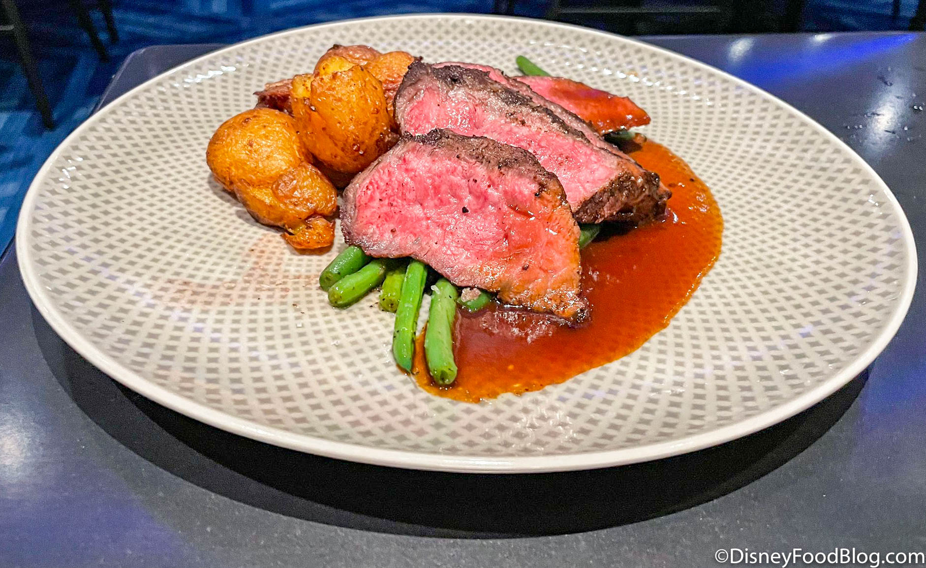 Next is the Flat Iron Steak with Coffee Space Rub, Smashed Fingerling Potatoes, Cabernet Butter, and Haricot Vert!