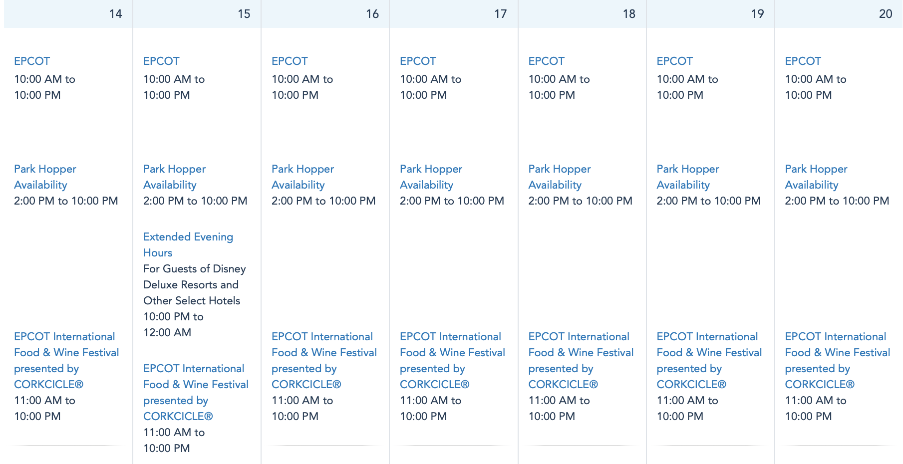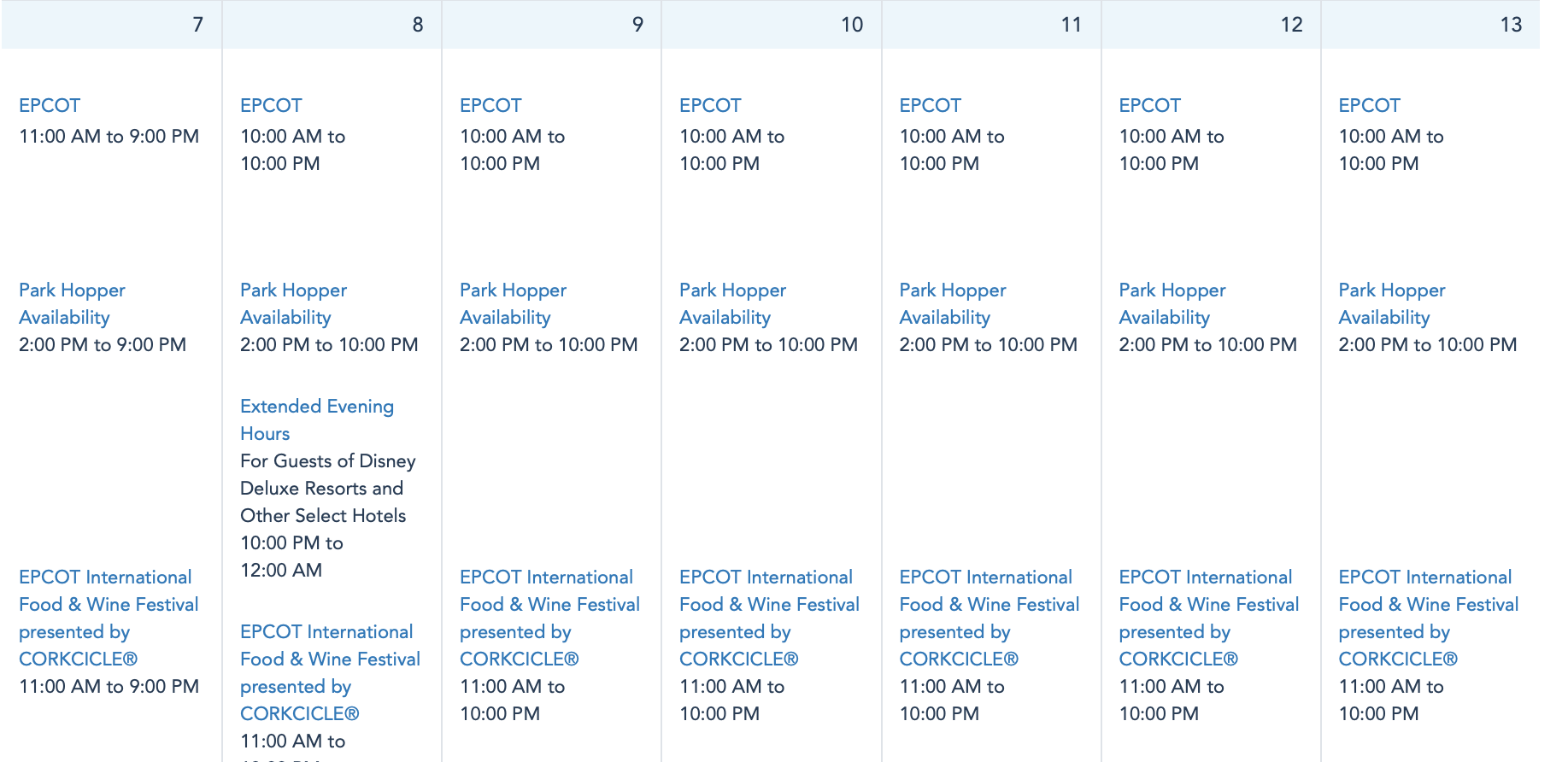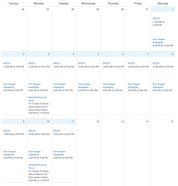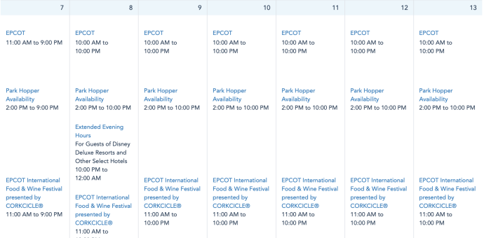 Beginning on November 8th, EPCOT will open at 10AM instead of 11AM. Its closing time remains at 10PM, and the EPCOT International Food and Wine Festival will still begin each day at 11AM.