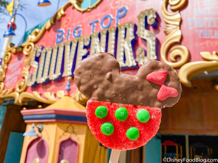For this trip, we opted for the Minnie Mouse Crispy Treat! This is a classic crispy treat shaped like Minnie Mouse with milk chocolate covering the ears and a red bow. The base is coated in white chocolate and covered in little red sprinkles and green M&Ms’.