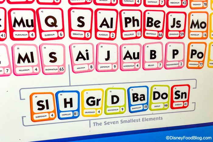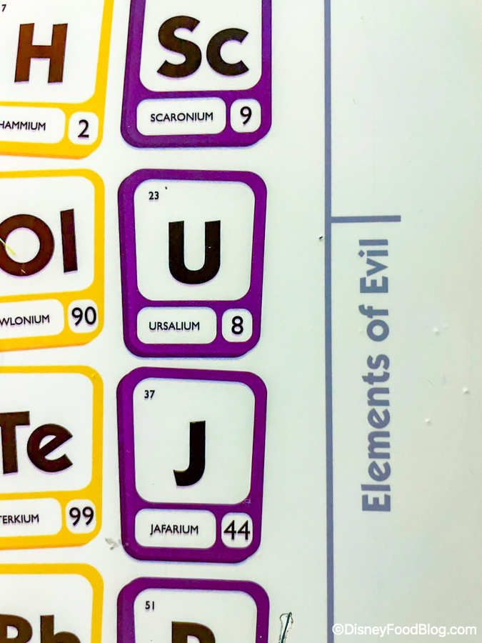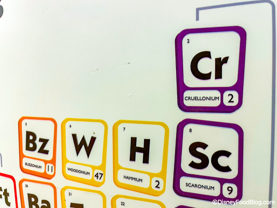 Other villains on the table include Ratcliffium, Maleficent, and Sidium. We guess Maleficent is evil enough to have the element match her actual name!