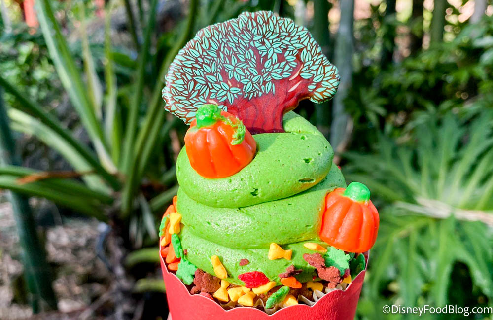 As we were scoping the parks for holiday treats, we spotted the Celebration of Autumn Cupcake lookin’ pretty on the shelves of Flame Tree Barbecue. While the cupcake is there for Thanksgiving, it had plenty of Fall flavors with a pumpkin cake, toffee cheesecake filling, cinnamon-flavored frosting, Tree of Life decal, candy pumpkins, and autumn leaf sprinkles. And, yes, the cupcake is JUST as huge as it looks!