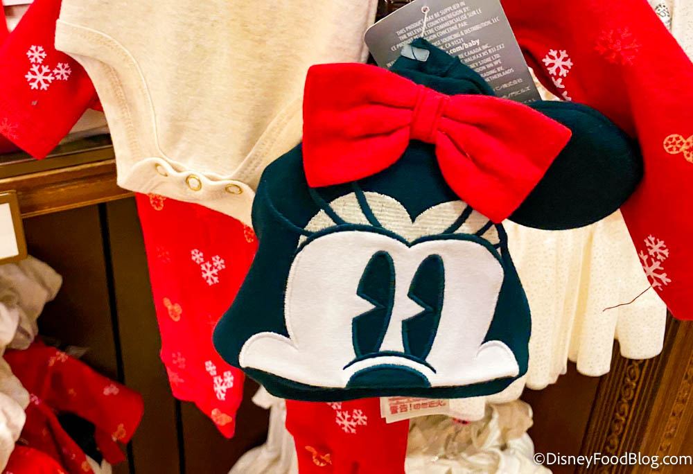 The onesie set comes with two Christmas onesies, some red snowflake pants, and this adorable Minnie Mouse hat.