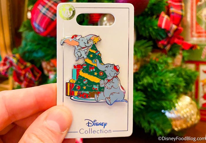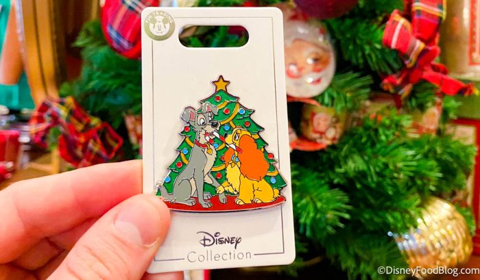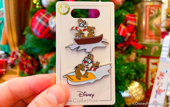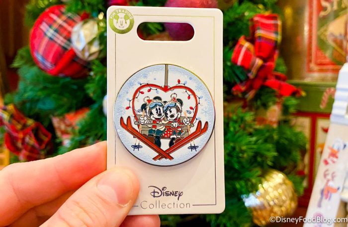 To round out all the merchandise, there were a few new Christmas-themed pins. We found one of Minnie and Mickey on a ski trip for $9.99…