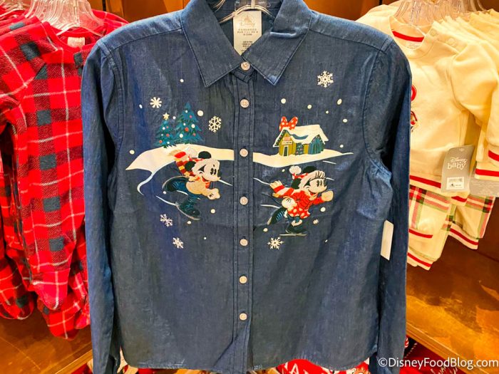 If you’re looking for a fancier top, we also found a denim collared shirt with a scene of Mickey and Minnie skiing on the front.