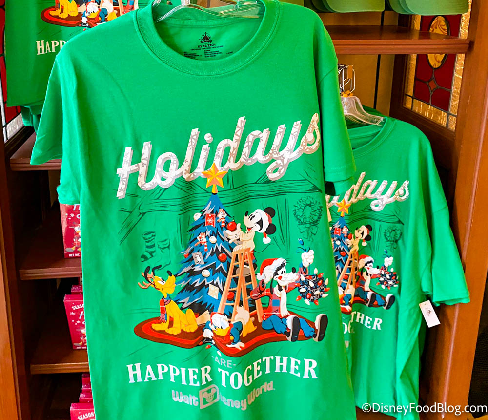 If your winter is going to be a little warmer, there were a couple of cute t-shirts available as well. We found a green one that says “Happier Together” with the gang decorating a Christmas tree for $24.99.