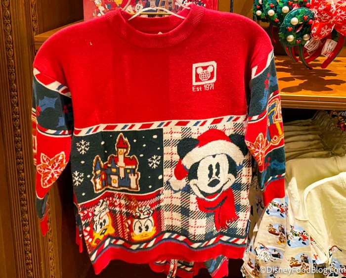 The knitted sweaters are designed like spirit jerseys, so the shoulder seam is farther down the sleeve. The bottom half has patterns of Mickey and other characters against holiday backgrounds.
