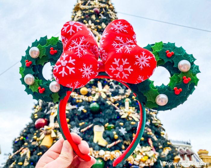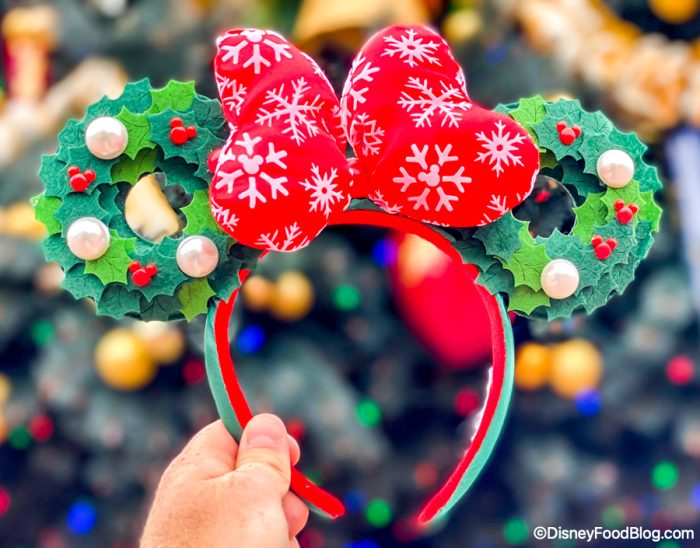 They have a red snowflake bow and the ears are two Christmas wreaths with little red Mickeys (that are definitely imitating holly)…