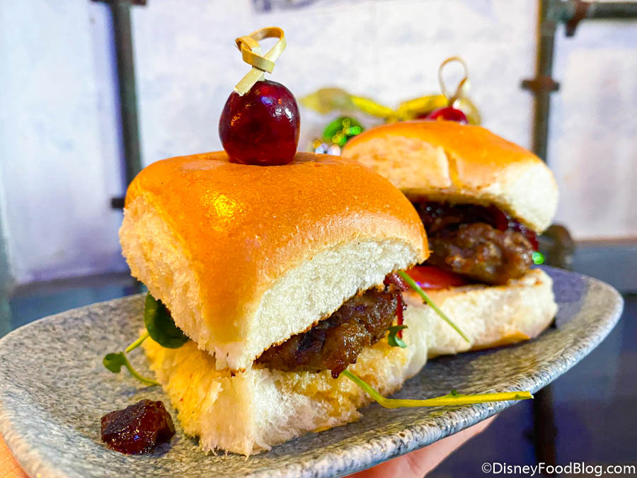 These were tasty! It’s certainly a thicker piece of meat on the sliders. They have great texture and we loved the cranberry aioli on them. The holiday vibes were strong.