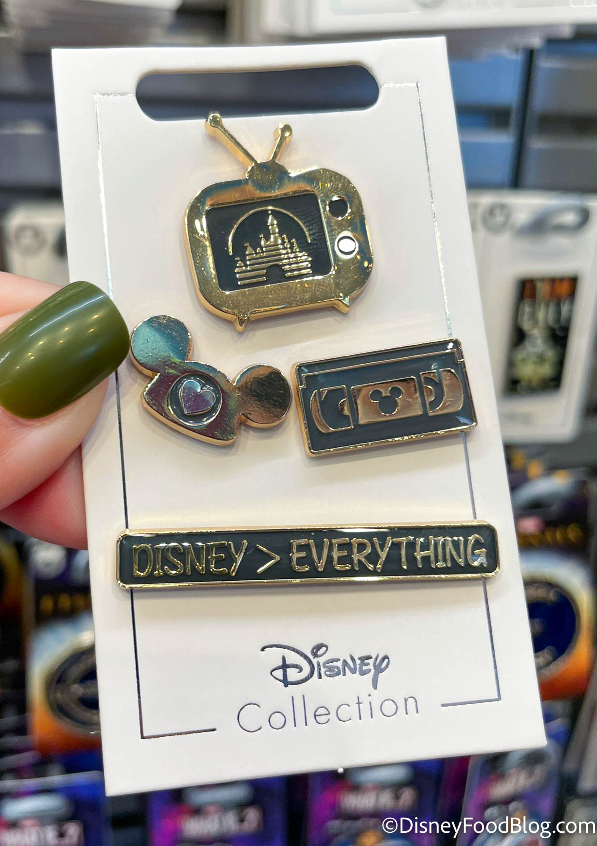 This retro Disney pin assortment of an old TV, a VHS tape, a Mickey hat, and Disney > Everything is priced at $17.99.