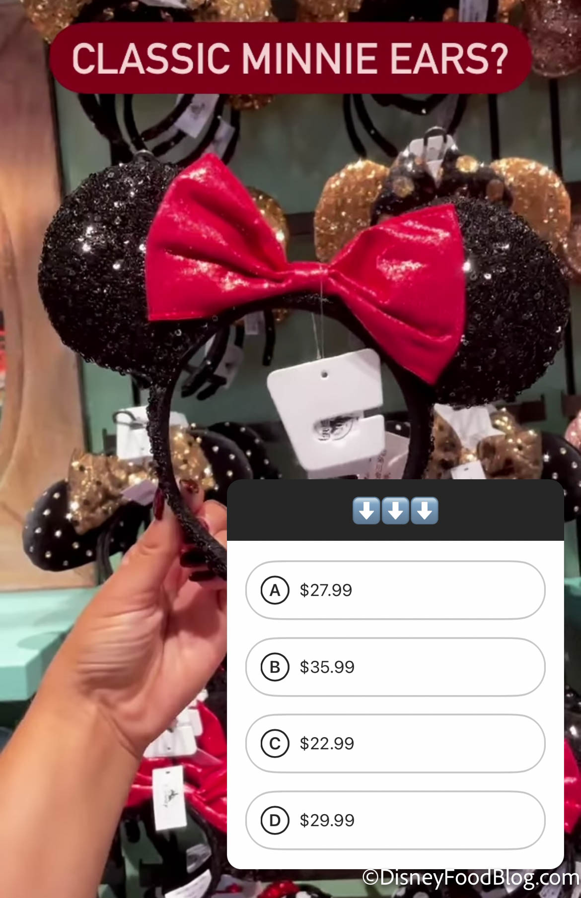 Our first question was for Classic Minnie Ears, because it’s harder to find a more iconic Disney World souvenir. So how much does a basic pair of Minnie ears cost now? $29.99! Some specialty ears cost $34.99, with more elaborate ears costing as much as $49.99. Most of you guessed correctly, but a lot of people thought ears cost $27.99!