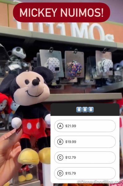 Disney nuiMOs are popular Disney collectibles, with small plush Disney characters you can accessorize with a number of outfits and accessories. But their price might be a little surprising, and this tiny Mickey nuiMO is $19.99. Keep an eye out for sales though, like this buy two get one sale we saw online recently. Many of our readers guessed $21.99, which is actually what some nuiMOs DO cost, like the Disney Princess nuiMOs.