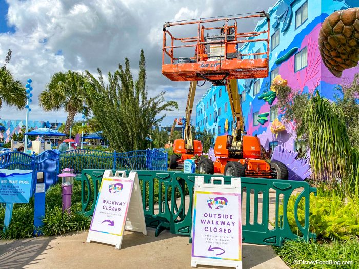 Lastly, we made our way over to Disney’s Art of Animation Resort to see if anything was new and noticed that a portion of the walkway around the Finding Nemo section of the hotel had its sidewalks blocked off. We didn’t spot any construction crews actively working on the buildings, but there were some pretty hefty cranes in the area.
