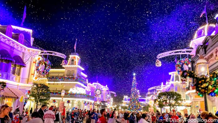 The crowds for the parade stretched all the way down Main Street, with people surrounding the whole parade route as “snoap” (that’s fake snow made out of soap) fell over the front of the park.