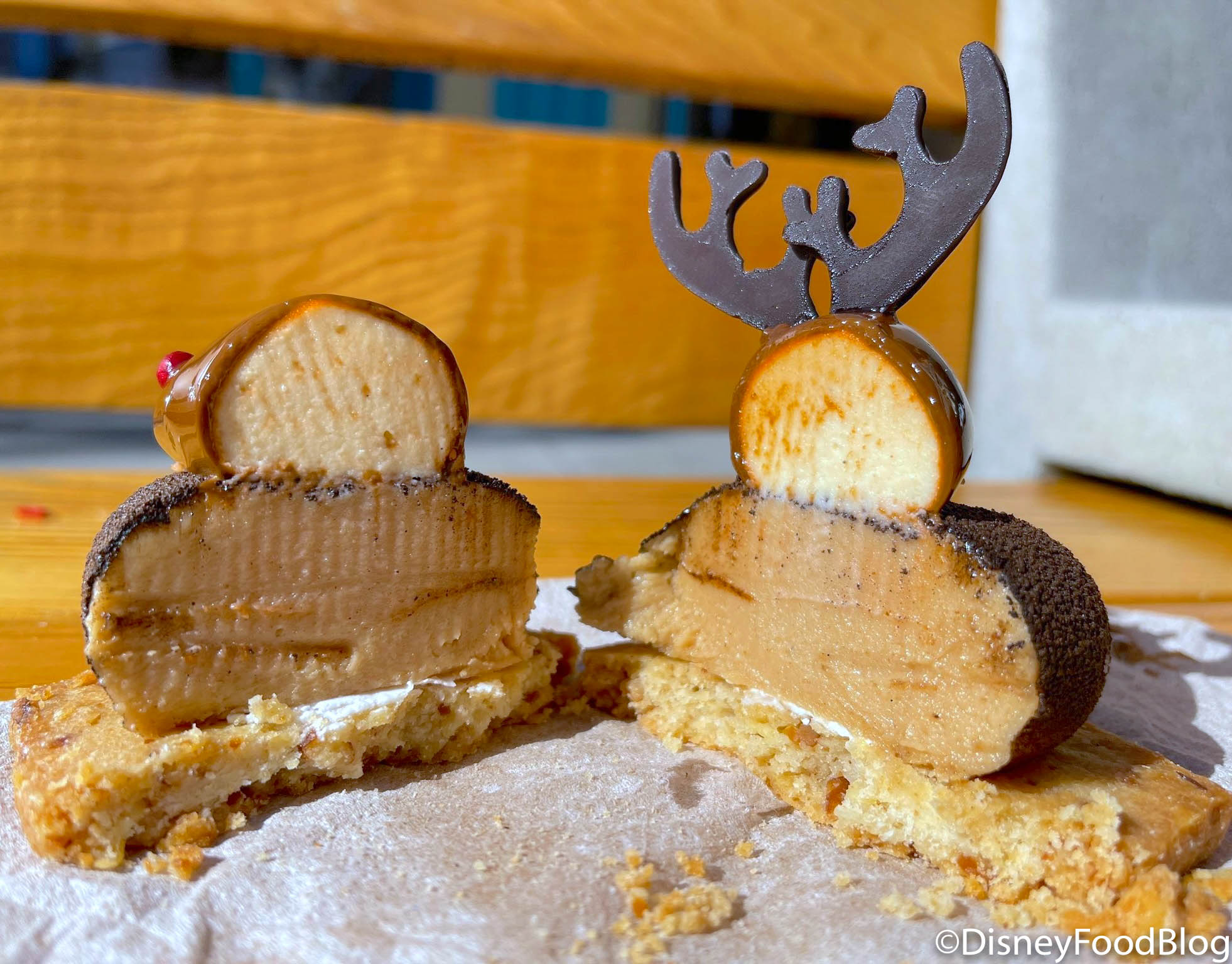 We’re headed to Rosie’s All-American Cafe in Disney’s Hollywood Studios for the Reindeer Mousse! This adorable dessert is made with spiced caramel cheesecake over peanut butter mousse on top of a salty pretzel shortbread cookie.