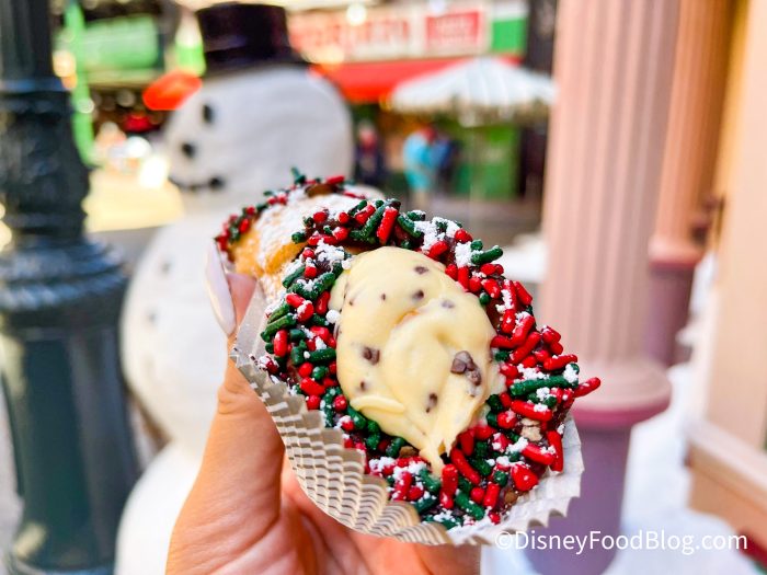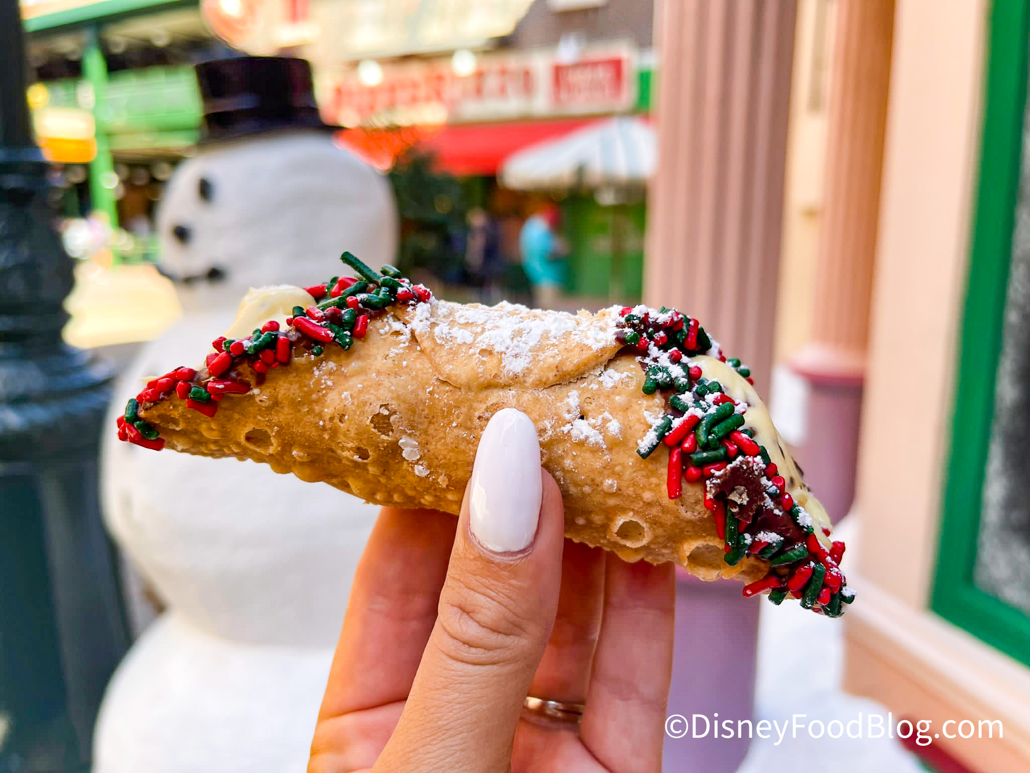 Although we’re always the ones to argue that there are way better places to grab a meal in Disney World, there have been some surprisingly good treats here lately like the Muppet Haunted Mansion eclairs! And, with the upcoming holidays comes a new (and HUGE) list of holiday treats, and some are located here. So, we’re back to try a NEW cannoli flavor — let’s see if it’s worth running to PizzeRizzo!