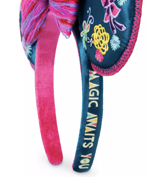 Check out these new Minnie ears for Disney’s upcoming film Encanto! The ears are blue satin with colorful embroidered flower designs and trimmed in a hot pink fabric. The bow is striped pink, red, and purple with a pom center.