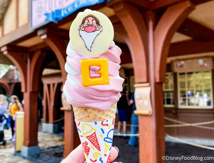 This spot often has different flavors of ice cream and floats (we’ve already tried and loved the Snow White Cone and the Heigh-Ho Sundae from this spot), so it’s no surprise that the new treat is a soft-serve ice cream cone! It’s called the Seven Dwarfs Specialty Cone.