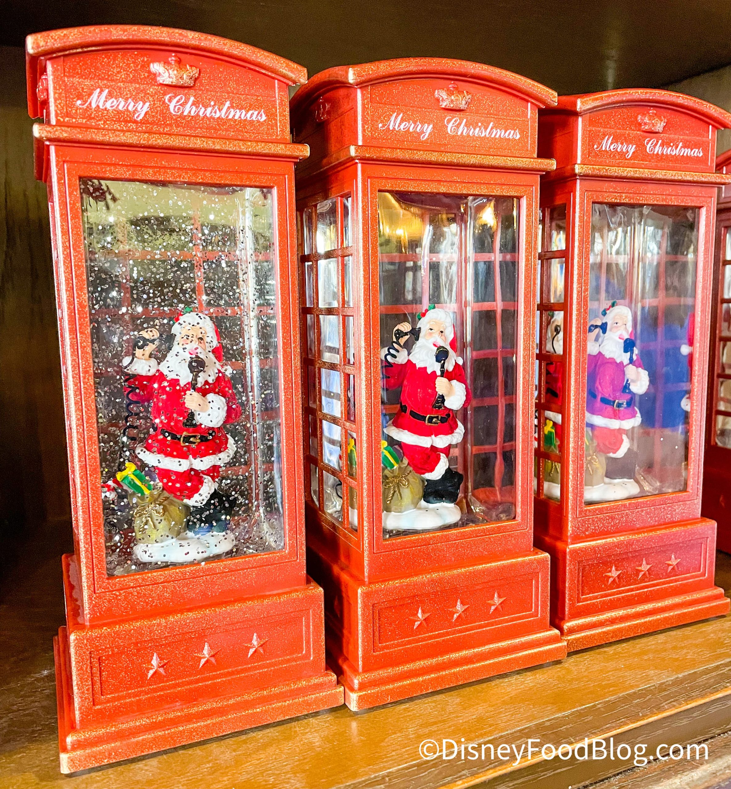 While almost all of the other Disney Parks have decked out for the holidays already, EPCOT has been a bit slower to go all-in on the trees, wreaths, and red and green this year. But, we spotted some of the FIRST Christmas merchandise when we were making our way through the shops in the UK Pavilion. Now you can find a Santa Phone Booth Snow Globe that lights up and fills with glitter in the Tea Caddy store!