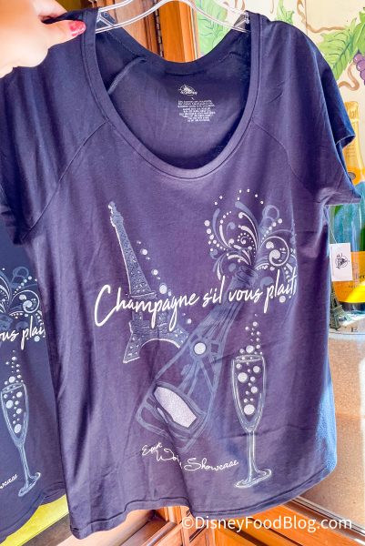 It’s no secret that we’re all for eating and drinking our way around the world and if you’re a big fan of champagne, then there’s a new shirt in the France Pavilion for you! The black tee features the Eiffel Tower, a champagne bottle, and champagne glass and says “Champagne s’il vous plait” on the front.