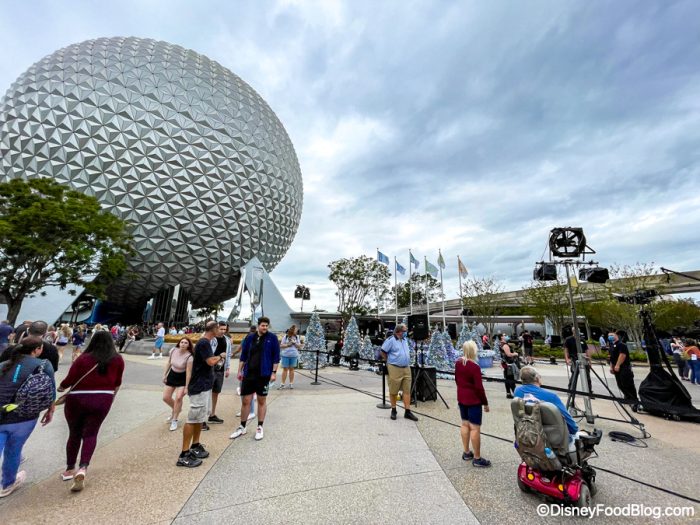 We noticed cameras and a small stage set up at the entrance of EPCOT today in front of Spaceship Earth.