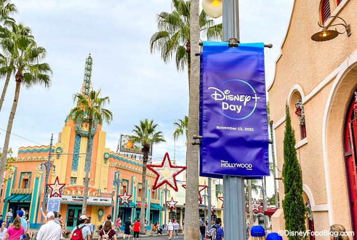 Next, we went over to Hollywood Studios to see what the celebrations were like there. The entrance was all decked out in Disney+ signage.