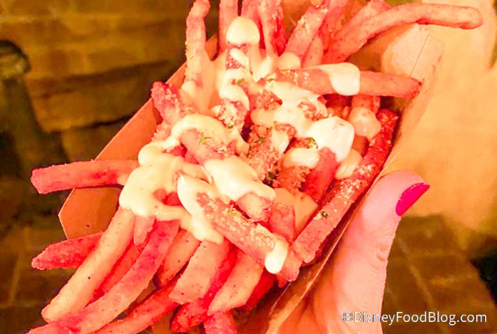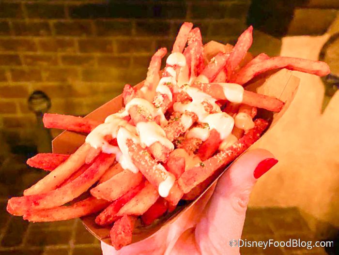 The second snack, though, was MUCH more satisfying. It’s the Enchanted Forest Fries, which are French Fries tossed in Buffalo Seasoning, drizzled with Ranch, and topped with Cotija Cheese for $3.99. And these we liked! They’ve got just a hint of spicy, but nothing too overwhelming.