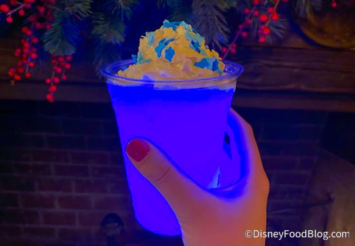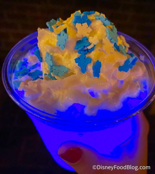 So we headed on over to Red Rose Taverne to check out their exclusive Merriest Nites offerings, starting with the Frozen Flurry. This drink, which costs $7.59, is a Citrus and Bubble Gum Slush topped with Whipped Cream, and Candy Decor. And of course, it comes with a Glow Cube. And what can we say? It looks cool!