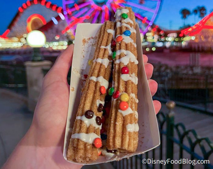 But take a closer look — because the “Christmas Chocolates” are M&Ms! They added a wonderful chocolatey crunch to the snack. We will TOTALLY get this baby again. Because YUM. Who doesn’t want a churro with M&Ms on it?