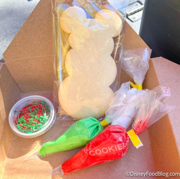 In the Cookie Decorating Kit, you get a Mickey-shaped snowman cookie, frosting in white, red, and green, and red and green sprinkles.