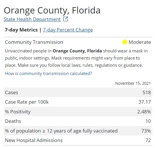 Data from the CDC has officially placed Orange County, Florida (one of the two counties in which Disney World is located) into the Moderate Tier of Community Transmission for COVID-19, down from the Substantial Tier.