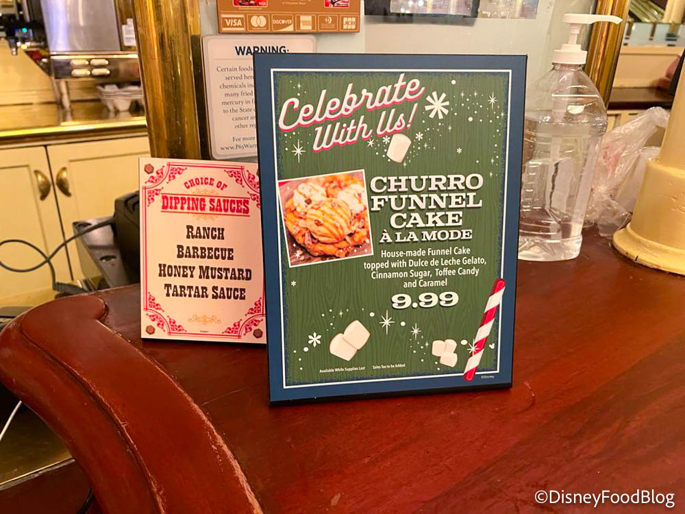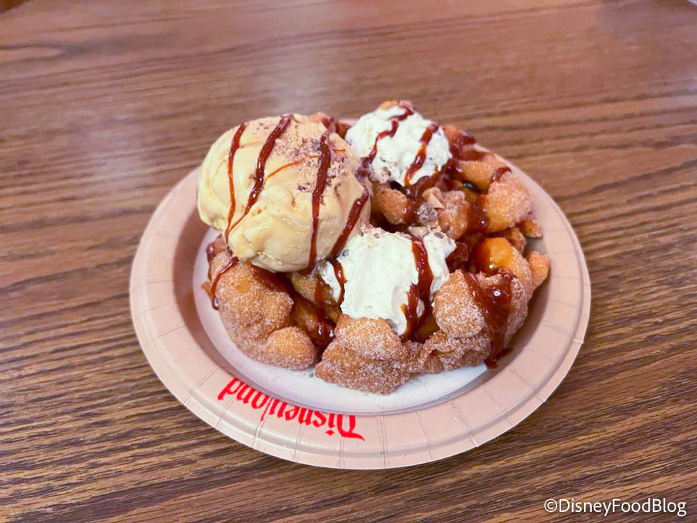 Now, this isn’t the first time we’ve seen the Churro Funnel Cake in Disneyland. We’ve even spotted it in different locations, like when it was over at Hungry Bear Restaurant back in 2016 (but that version didn’t have ice cream). This year’s version is a house-made funnel cake topped with dulce de leche gelato, cinnamon sugar, toffee pieces, and caramel.