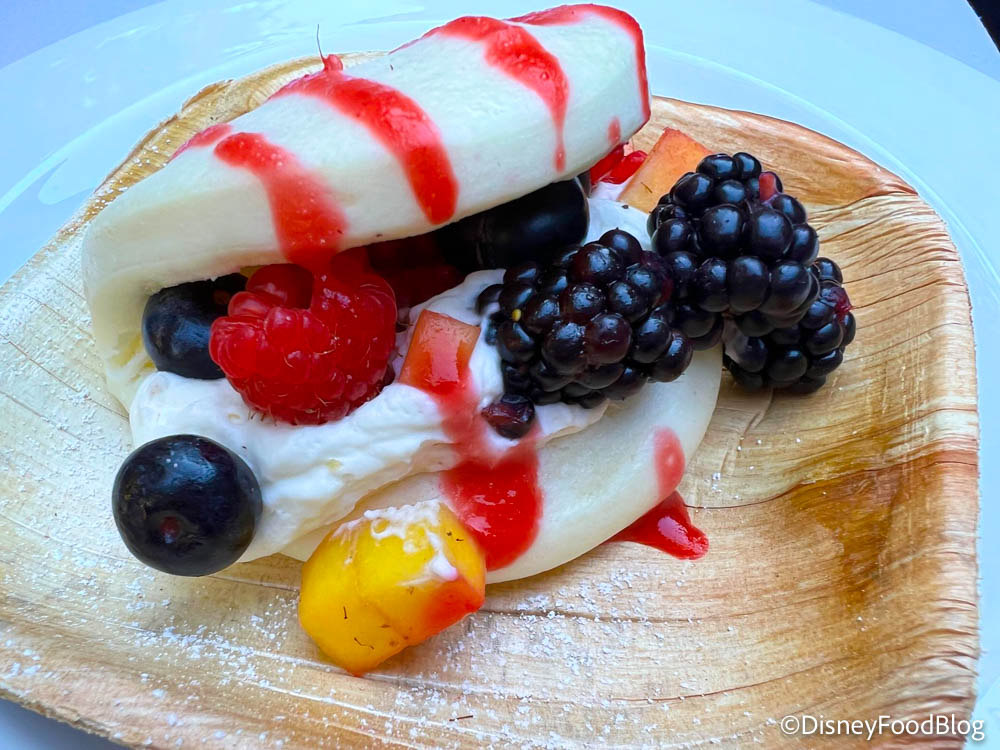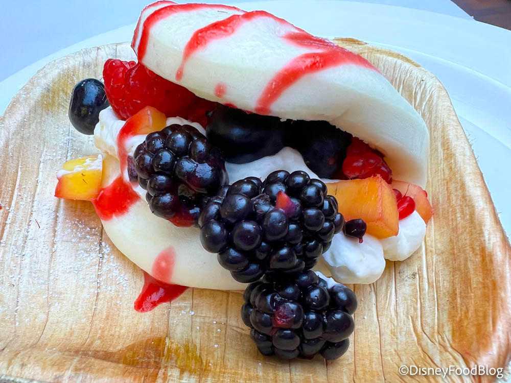 We’re at least going to tell ourselves that this one is “healthy” as it’s made with a crispy bao bun that is filled with seasonal fresh fruit tossed in a berry sauce and dusted with powdered sugar. We got to try this one during the media event for Festival of Holidays.