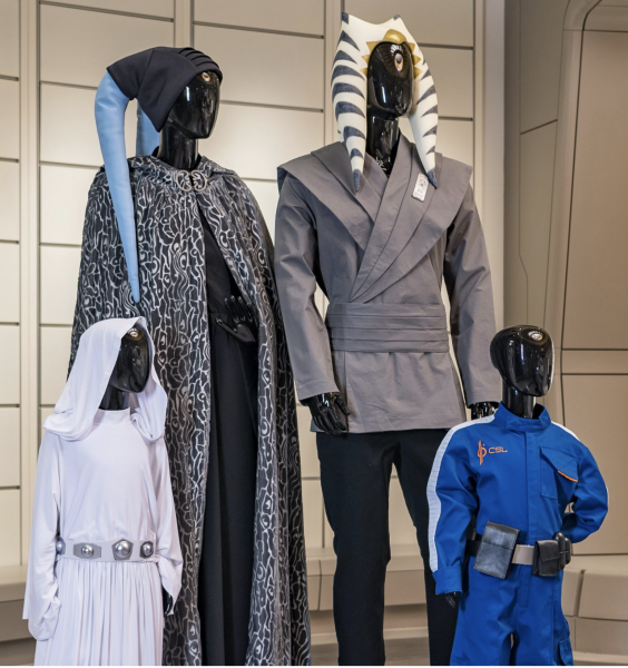 There will also be Star Wars-inspired galactic fashions, like this customizable black space dress. Next to that dress is a Bail Organa-inspired outfit, complete with replicated wrist gauntlets.