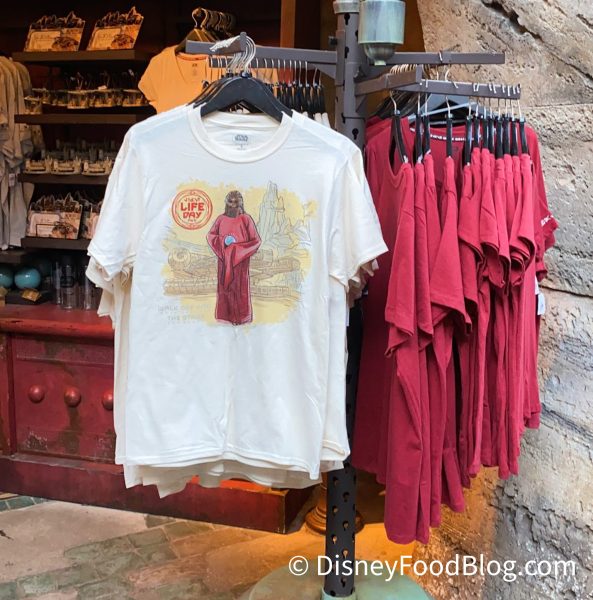 What we did spot around the marketplace in Galaxy’s Edge made us geek out just a little. Available collectables we found today included Life Day t-shirts…
