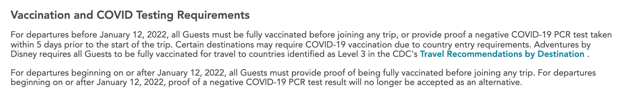 Disney has released a statement saying, “For departures beginning on or after January 12, 2022, all Guests must provide proof of being fully vaccinated before joining any trip. For departures beginning on or after January 12, 2022, proof of a negative COVID-19 PCR test result will no longer be accepted as an alternative.”