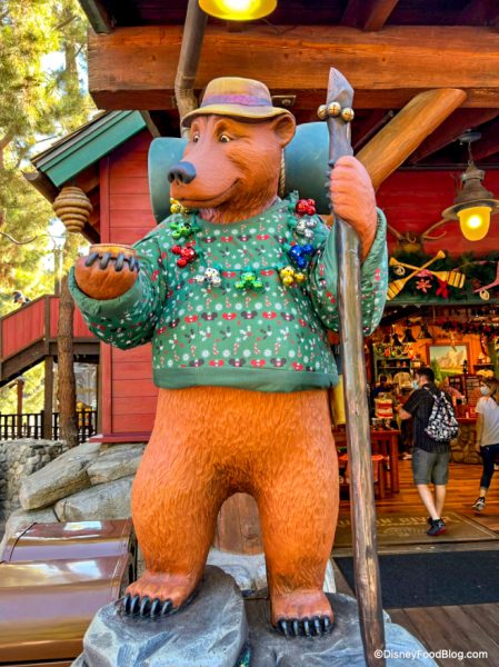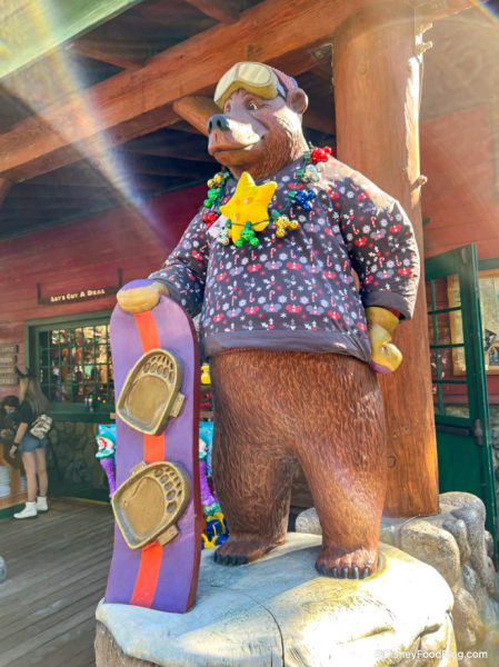 Before we head into the shop, we have to talk about the adorable bear statues! In the Grizzly Peak area, these bears stand year-round, but they get a special makeover during the holidays. The Rafting Bear gets a cute hat and a festival red sweater…